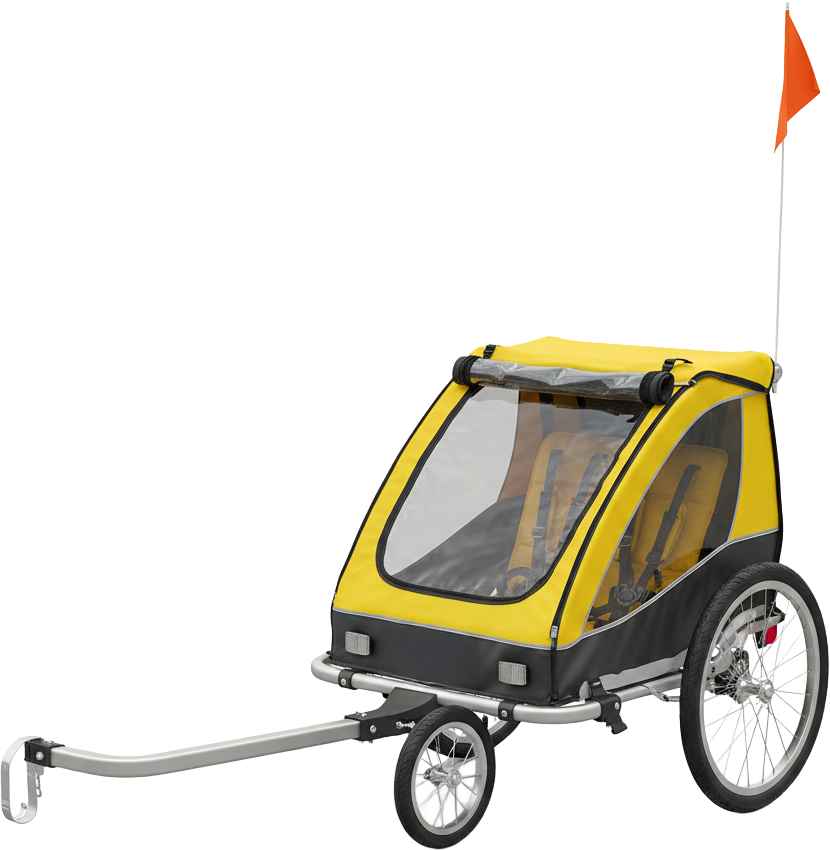 Przyczepa podłączana do roweru, przeznaczona do przewożenia dzieci w bezpieczny i wygodny sposób. Dzięki solidnej konstrukcji, pasom bezpieczeństwa i osłonie chroniącej przed warunkami atmosferycznymi, jest często bezpieczniejsza i wygodniejsza niż klasyczne foteliki rowerowe.